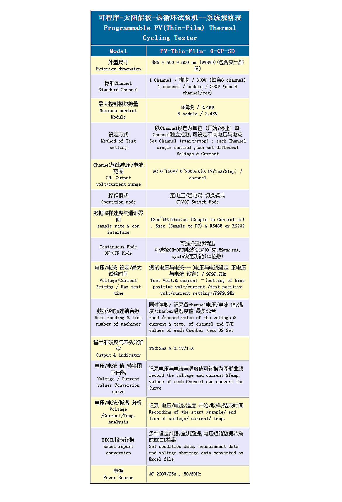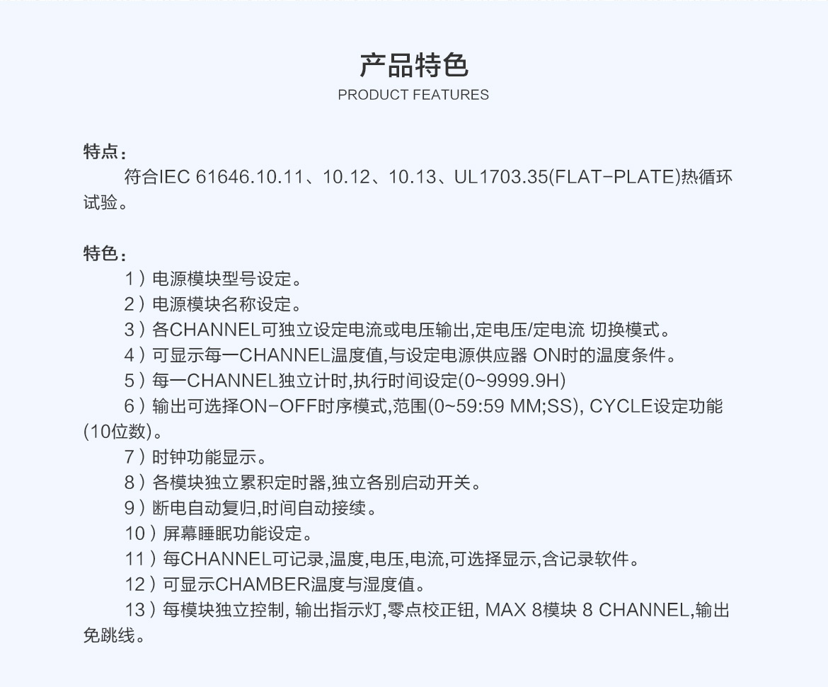 特点:符合IEC 61215.10.11、10.12、10.13、UL1703.35(Flat-Plate)热循环试验。
