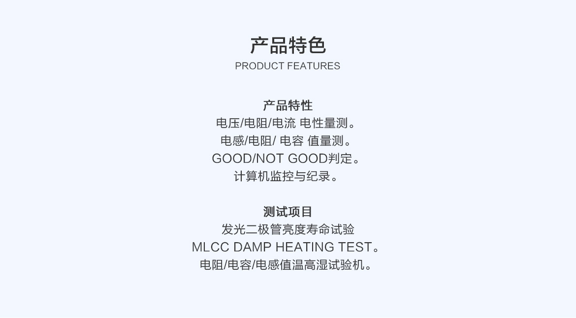 测试项目: 发光二极管亮度寿命试验; MLCC Damp Heating Test; 电阻/电容/电感值温高湿试验机。