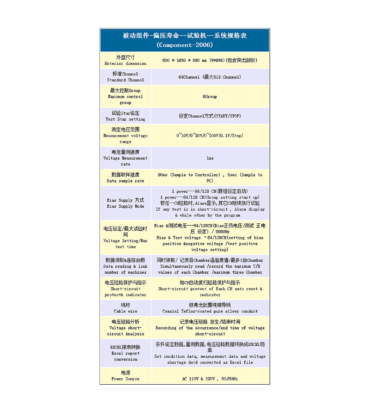 测试项目: 电容器高压穿击测试。 电阻偏压寿命测试。 IC Bias Lift Test。 二极管高温逆偏压测试(HTRB)。