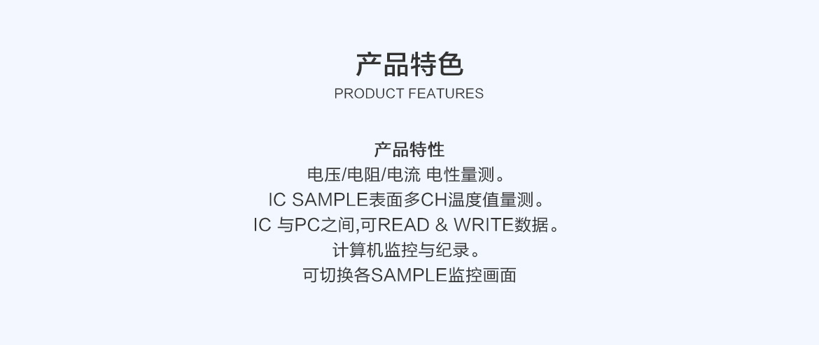 产品特性: 电压/电阻/电流 电性量测。 IC Sample表面多CH温度值量测。 IC 与PC之间,可Read & Write数据。 计算机监控与纪录。 可切换各Sample监控画面。